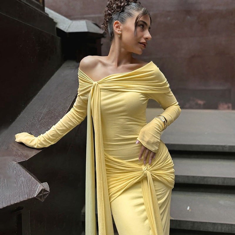 Elegant and captivating, The Warm Bella is a masterpiece of socialite-inspired dress designed to celebrate feminine confidence with a refined edge. This off-the-shoulder gown features a sophisticated silhouette that expertly sculpts the body through strategic draping and intricate knot details at the shoulder and hip.